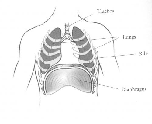 Observe na figura abaixo , a traquéia, os pulmões, as costelas e o diafragma, um músculo muito importante que controla a entrada e saída de ar dos pulmões.